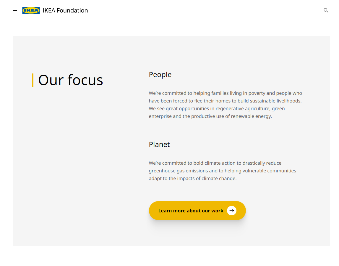 - IKEA: In its production, IKEA has committed to producing more renewable energy than it consumes in its operations. They’ve also helped make sustainability accessible to a wider consumer base by offering eco-friendly products at affordable prices. It doesn't just stop at furniture however; IKEA has the IKEA Foundation, a philanthropic organization dedicated to a variety of issues centered around sustainability and social issues like poverty and refugee livelihood. IKEA benefits from its commitment to sustainability and relationship building in their marketing because they can communicate their sustainability journey with customers to build closer, long-lasting relationships.