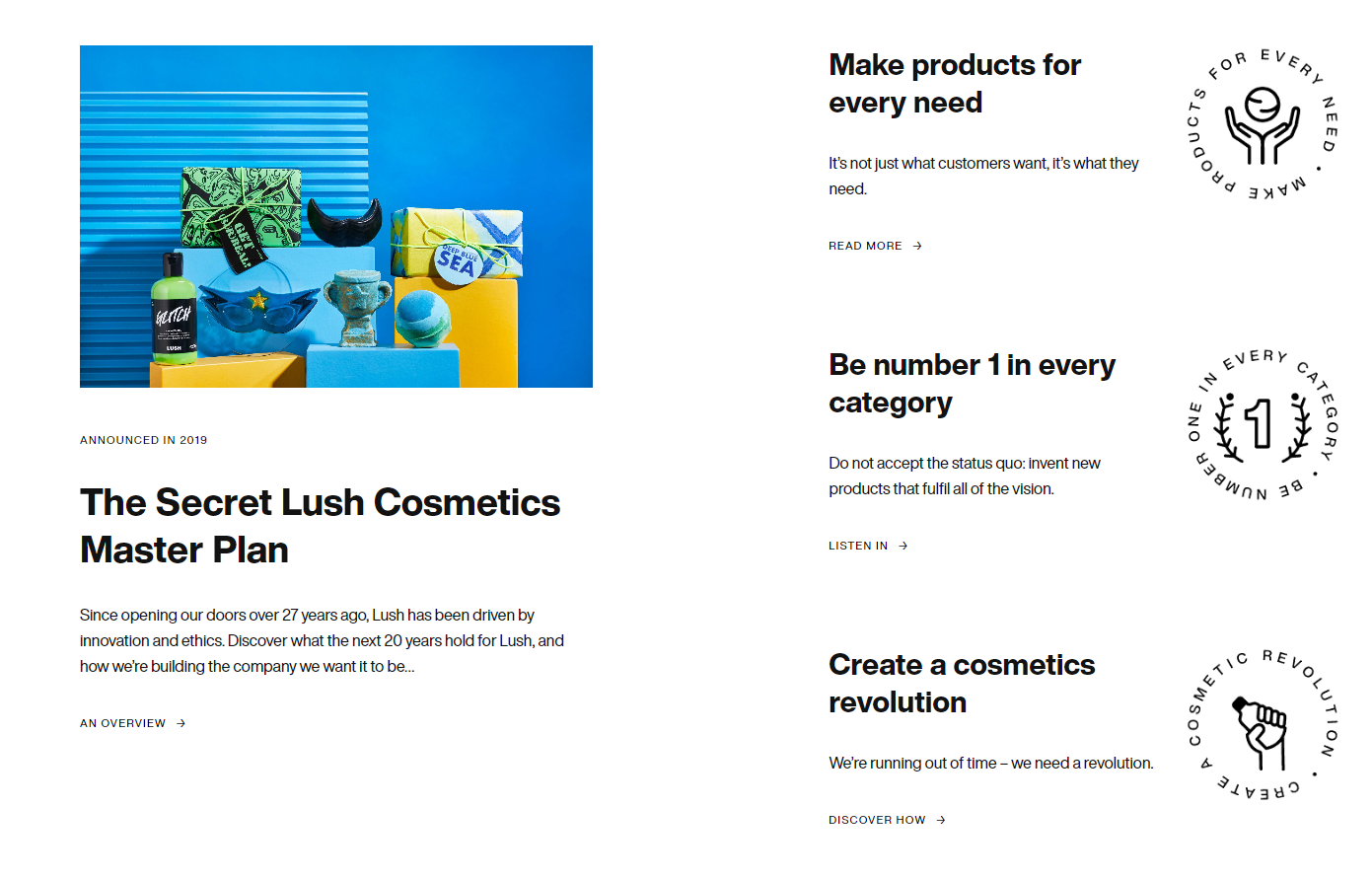 - LUSH: When you walk into LUSH, its impossible not to recognize their commitment to product purity, chemical-free beauty, and sustainability. LUSH promotes a packaging-free approach with its naked products, reducing plastic waste. They also regularly donate profits to various social justice initiatives, and are well known for their Charity Pot, a body lotion with which they donate 100% of the price to grassroots social organizations so customers are clearly informed of their direct impact. Along with these initiatives, they also pride themselves on having ethically made, vegetarian, and cruelty-free products while also promoting waste-reduction through their Bring it Back program. All in all, LUSH is a great example of sustainable brand advocacy that is consistent and deeply reflected across its whole persona.